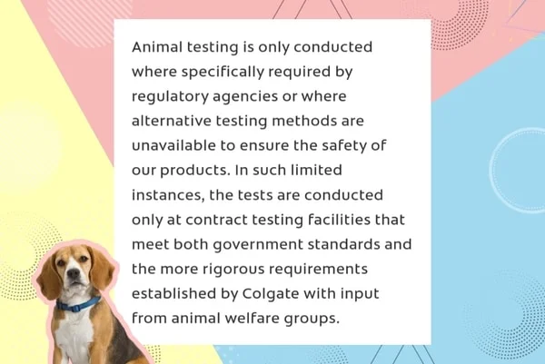 Colgate shares that it is against animal testing and how its scientists are working for a better alternative. However, it still has to follow the guidelines where animal testing is mandatory by law.